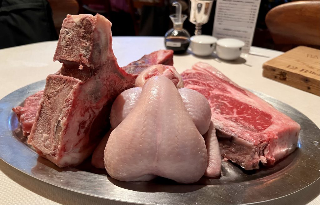 目の前でお肉を眺めながら、お店の方がお肉の説明をしてくれ、千代幻豚、若鶏一羽、骨付きドライエイジングビーフ、骨付き特選ドライエイジングビーフと。特選がつくのとつかないのはどう違うのか聞いたら、脂のサシが入っているか、いないかの違いになるそうです。