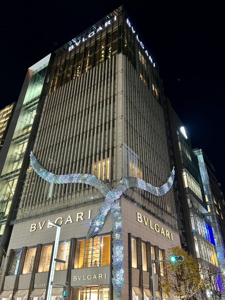 ブルガリの素敵なイルミネーションに見惚れて、どこかで晩御飯して帰ろうってことに。